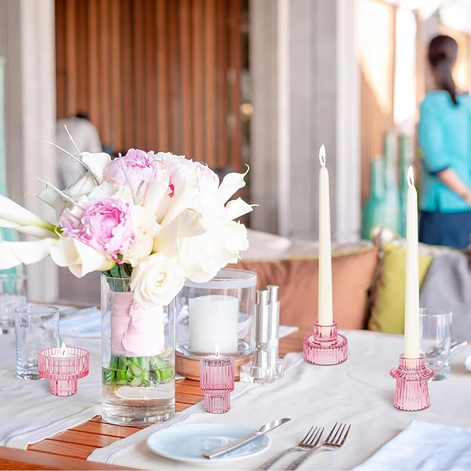 Taper Votive Candle Holder for Pillar Candles Tealight, Candlestick Holder for Wedding Christmas Tea Party, Boho Ribbed Vintage Crystal Glass Table Centerpiece Decor, Bulk Set of 6 (Pink)
